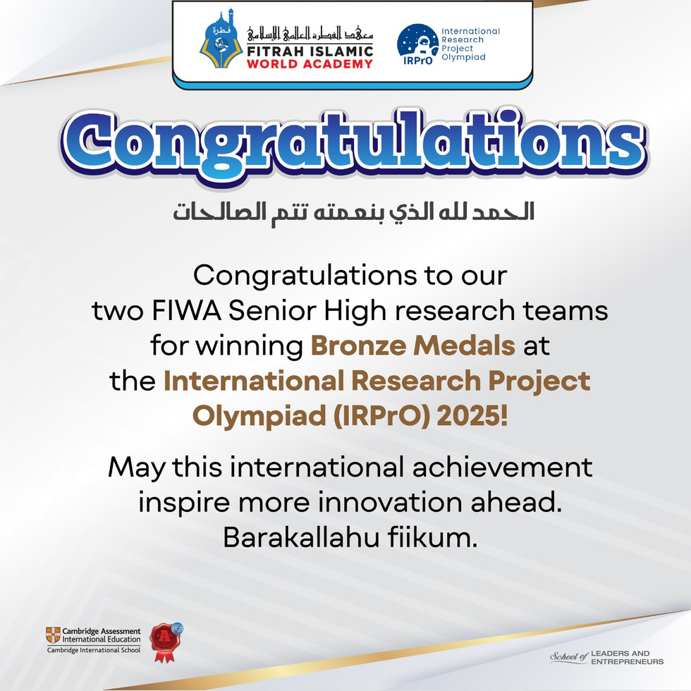 Two research teams from FIWA Senior High School have successfully earned bronze medals at the International Research Project Olympiad (IRPrO) 2025. This competition brought together young innovators from various countries to showcase original scientific projects that address real-world issues.