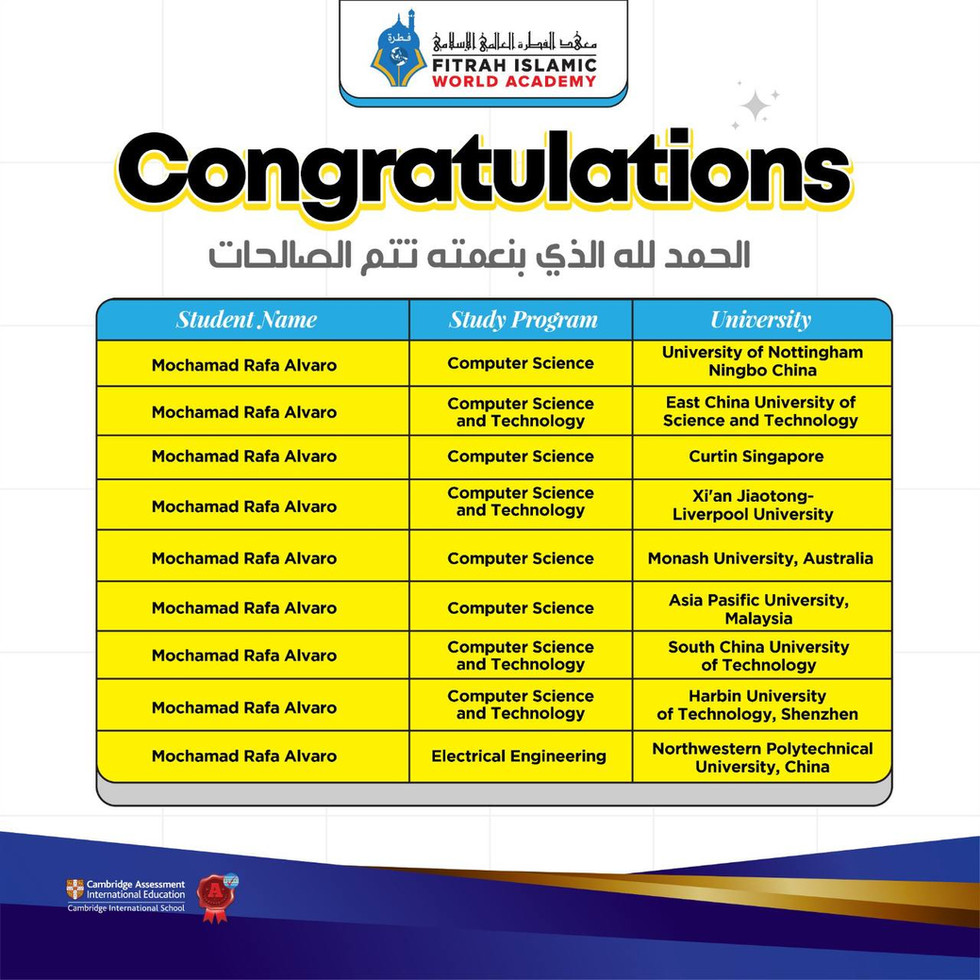 Alhamdulillah, we’re proud to share another great achievement from one of our students.Mochamad Rafa Alvaro has been accepted to nine international universities across China, Singapore, Malaysia, and Australia, majoring in Computer Science and Electrical Engineering.